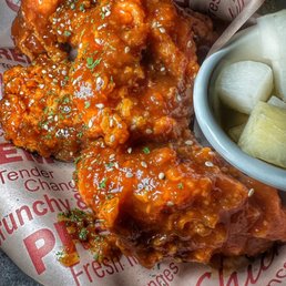 I think I would like to give Pelicana something between 3 and 4 stars. While the chicken was very tasty, I just don't think it justifies the price. I ordered takeout and got their crispy fried wings with signature sauce. Service was friendly and pickup was prompt. Pickled radish is free, even though the menu makes it seem like they charge for it. It comes in these slightly inconvenient peel-back packages that will spill as soon as the seal is disturbed, so open with caution! When I opened the box, I had a definite moment of "oh those are smaller than I expected". For $20 + tax, the amount given just didn't wow me. The sauce is sticky-sweet with a bit of caramelization, and the meat itself is very tender. Honestly since I was ordering to-go, I should have saved myself a dollar and gotten their classic chicken, since the drive home through rush hour traffic will beat the crispiness out of everything. I might come back to try Pelicana in-store to get the True Crispy Experience, but I don't think this is a must-try or a super impressive spot for me. The chicken was nice, yes, and it reheated well, but it wasn't enough to really wow me.